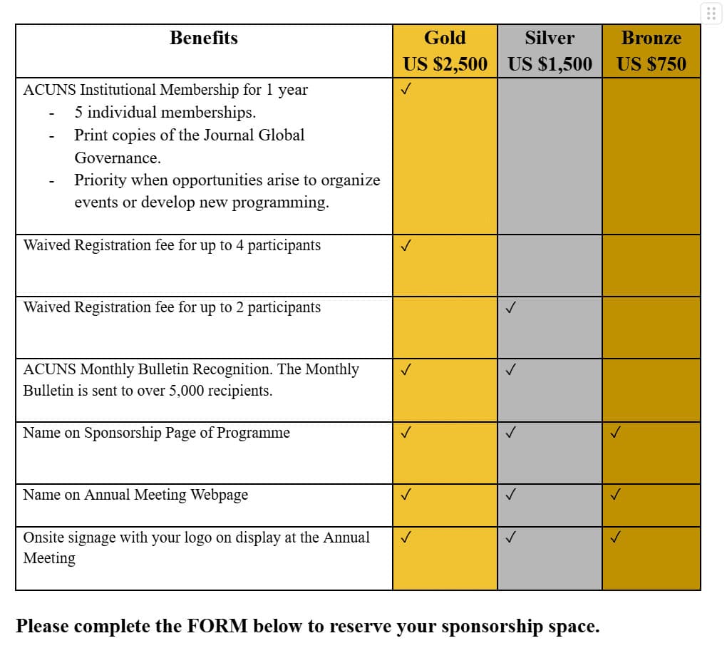 Thank you for your generous support of the 2026 ACUNS Annual Meeting. Your contribution will subsidize the travel of Global South scholars and will cover some of the Annual Meeting expenses. Thank You to our Hosts and Sponsors!